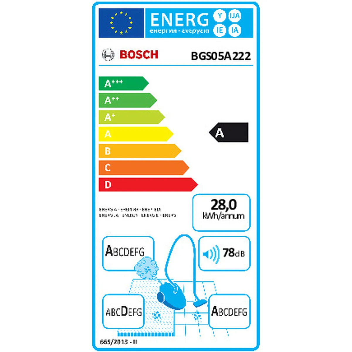Bosch Serie 2 BGS05A222. Potencia máx. de entrada: 700 W. Tipo: Aspiradora cilíndrica, Tipo de limpiador: Secar, Tipo de depósito: Sin bolsa, Capacidad para polvo: 1,5 L. Filtración de aire en aspiradora: EPA, Micro, Método de separación de la suciedad: Ciclónico/filtrado, Nivel de ruido: 78 dB. Color del producto: Negro, Blanco