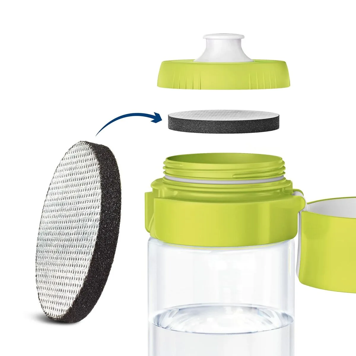 Brita Fill&Go Bottle Filtr Lime. Tipo de filtro de agua: Botella con filtro de agua, Color del producto: Cal, Transparente, Material: Plástico. Ancho: 78 mm, Profundidad: 72 mm, Altura: 245 mm. Cantidad de cartuchos: 1 pieza(s), Cantidad por paquete: 1 pieza(s)