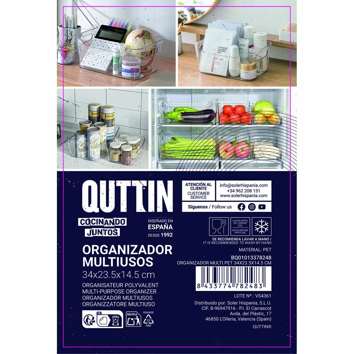 La caja de almacenaje Quttin es un organizador multiusos práctico y versátil, fabricado en material PET, reconocido por su durabilidad y resistencia a impactos, lo que garantiza una protección adecuada de los objetos almacenados. Procedente de China, esta caja está diseñada para optimizar el espacio gracias a unas dimensiones aproximadas de 34 x 23,5 x 14,5 cm, adecuadas para guardar desde elementos de oficina hasta accesorios del hogar o materiales de manualidades. Este set incluye 10 unidades, facilitando la organización y clasificación de múltiples objetos a la vez, ideal para usuarios que requieran un sistema ordenado y eficiente en sus espacios. La naturaleza multiusos de este organizador permite su uso tanto en oficinas, talleres o en el hogar, adaptándose a diferentes necesidades de almacenaje sin perder funcionalidad ni estética. Su diseño robusto y liviano hace que su manipulación sea sencilla, además de permitir el apilado para un mejor aprovechamiento del espacio. Las cajas de almacenaje Quttin destacan por ofrecer una solución práctica para quienes buscan mantener un entorno limpio y ordenado, conjugando resistencia, cantidad y un tamaño optimizado en un solo producto. En conjunto, esta caja Quttin representa una opción equilibrada y funcional dentro de la categoría de almacenaje, destinada a cubrir múltiples necesidades cotidianas de organización.