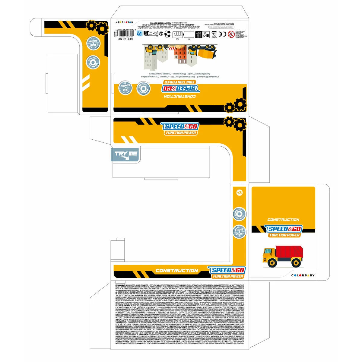 ¡Dirige tu propia obra con el camión de construcciones Speed&Go! Hay 2 modelos diferentes: camión volquete o camión hormigonera, ¿cuál te gusta más? El camión volquete puede levantar su carga para dejar caer la tierra y la hormigonera puede girar para mezclar el cemento. El camión emite luces de colores y se desliza por sistema de fricción. Tiene un diseño realista como los camiones de verdad y funciona con 3 pilas tipo AG13 (incluidas). Juguete eléctrico recomendado a partir de 3 años que fomenta la imaginación, la orientación espacial y la estimulación sensorial.