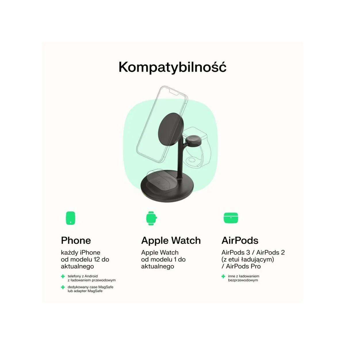 • Productos compatibles: Magnetic case friendly – ładowarka współpracuje ze wszystkimi etui wyposażonymi w system Apple MagSafe i jest również kompatybilna z innymi telefonami, takimi jak Samsung Galaxy czy Google Pixel.