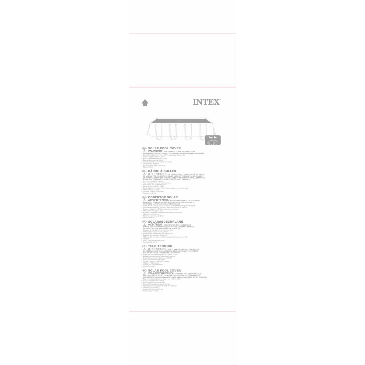 Cobertor solar INTEX de 378 x 186 cm recomendado para mantener el calor en piscinas desmontables INTEX Prism Frame rectangular de 400 x 200 cm (Ref. 28350, 26776y 26788). Reduce un 95% la evaporación del agua. Fabricado con polietileno y de 150 gr/m2 de espesor. Tiene agujeros de drenaje para el agua de lluvia. Peso del cobertor: 1,7 kg.