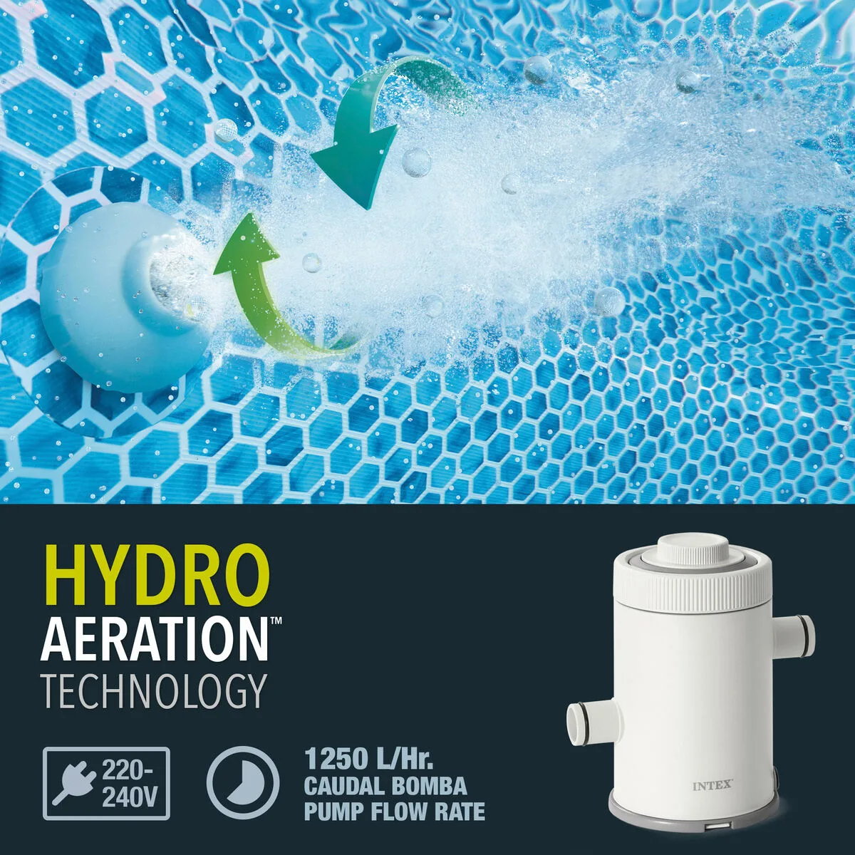 • Filtración eficiente para piscinas: capacidad de 1.250 l/h, ideal para piscinas de hasta 7.900 litros, manteniendo el agua limpia y en constante circulación