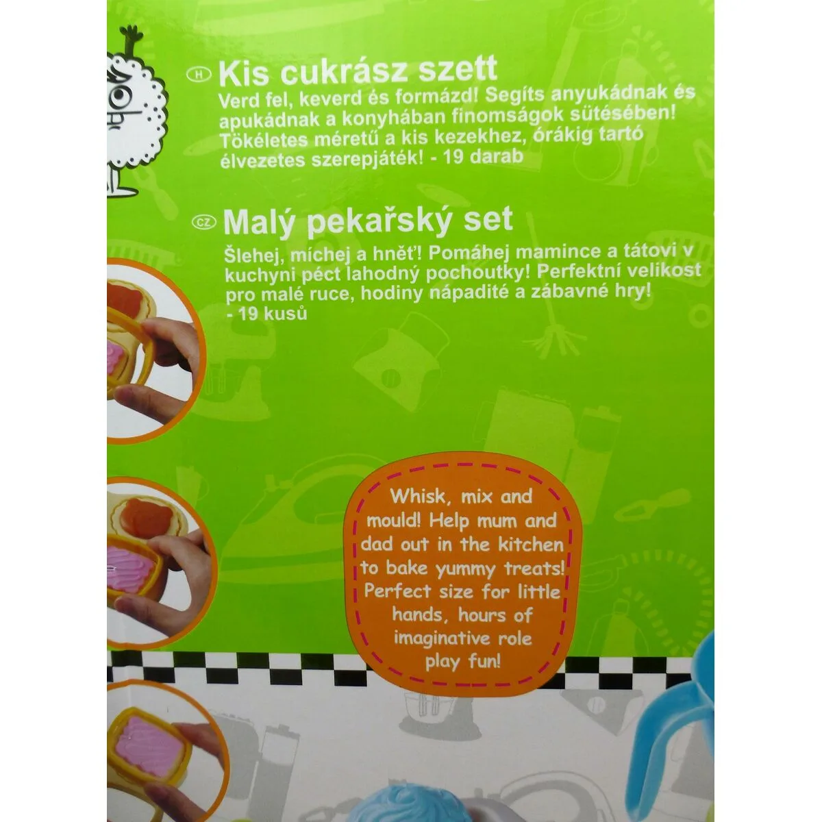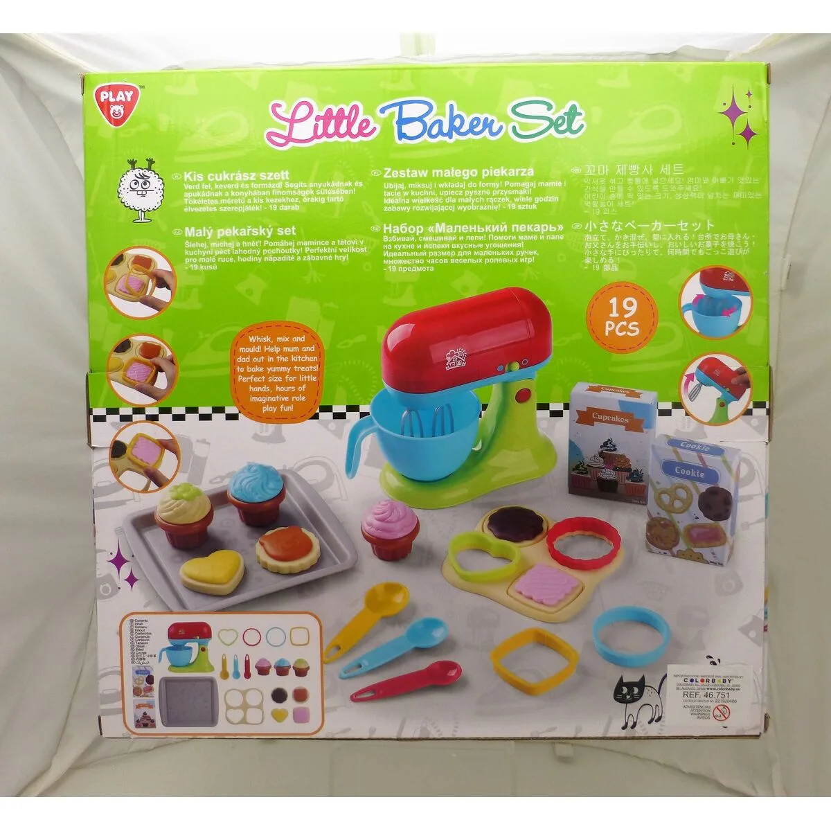 - Incluye: 1 batidora eléctrica, 1 bandeja, 1 caja de gallletas, 1 caja cupcakes, 4 moldes con formas, 3 cucharas, 3 cupcakes y 4 galletas.
