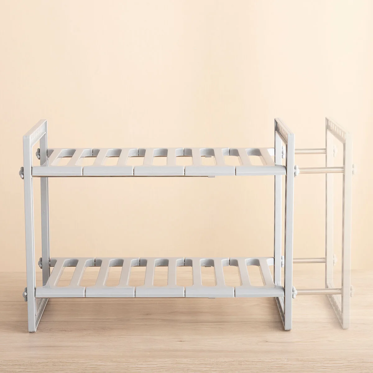 Los 2 estantes se pueden colocar en variasposiciones, según la altura deseada. Los 10 soportes independientes se puedenquitar, poner y desplazar donde se desee en cada uno de los 2 estantes, lo quefacilita el almacenaje de objetos de diferentes tamaños y deja el espacionecesario para el tubo de desagüe del fregadero.