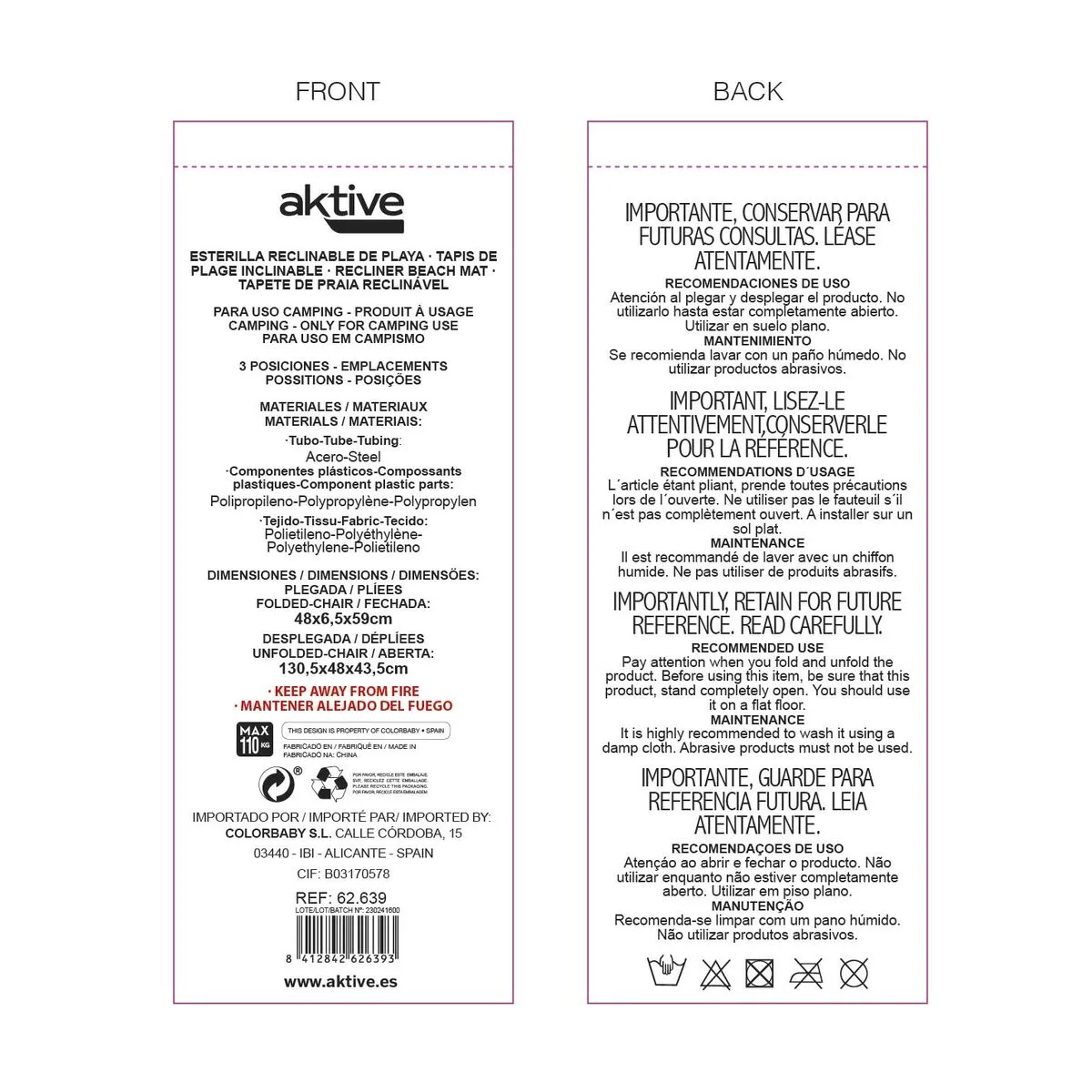 Esterilla de playa con respaldo, cojín acolchado y bolsillo de la línea Aktive Beach. Cuenta con base acolchada de polietileno color azul con bordes color gris. La estructura de la esterilla permite dos posiciones: totalmente horizontal y respaldo inclinado hasta en 3 posturas diferentes gracias al soporte de acero incluido. Además, incluye un cojín acolchado y un bolsillo trasero para guardar el móvil, las revistas o cualquier accesorio que lleves a la playa contigo. Tiene capacidad para una persona Y soporta un peso máximo de 110 kg. Se pliega y se transporta como un bolso gracias a la bolsa de transporte con asa incorporada.