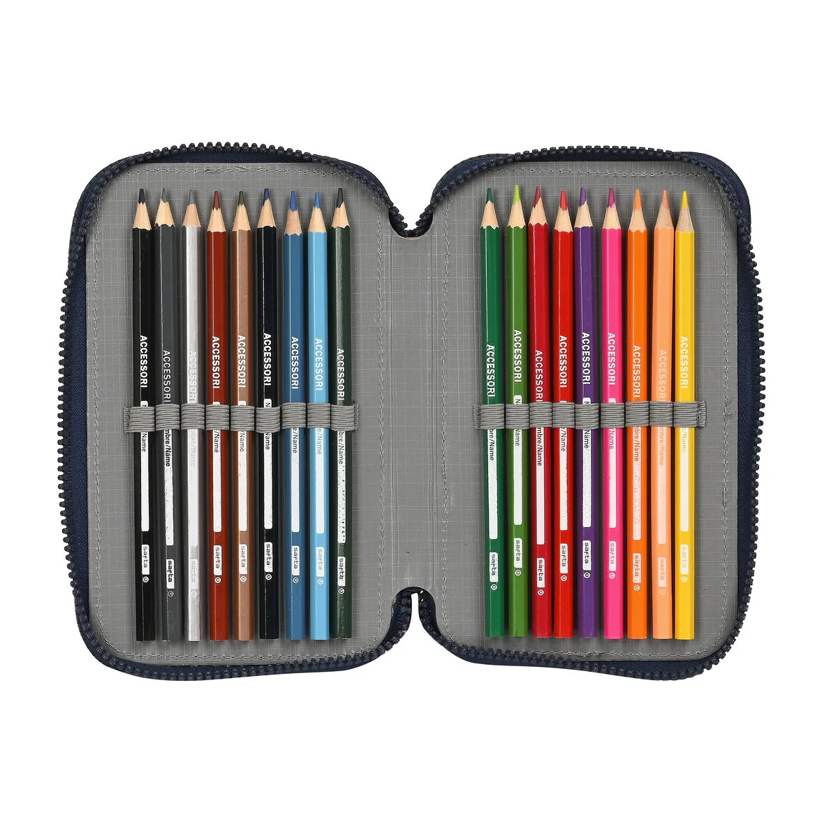 Contiene 41 piezas : goma, lápiz de grafito, bolígrafo azul, bolígrafo negro, sacapuntas, regla, semicírculo (1er compartimento), 18 colorines de madera (2º compartimento), y 16 rotuladores de colores (3er compartimento).