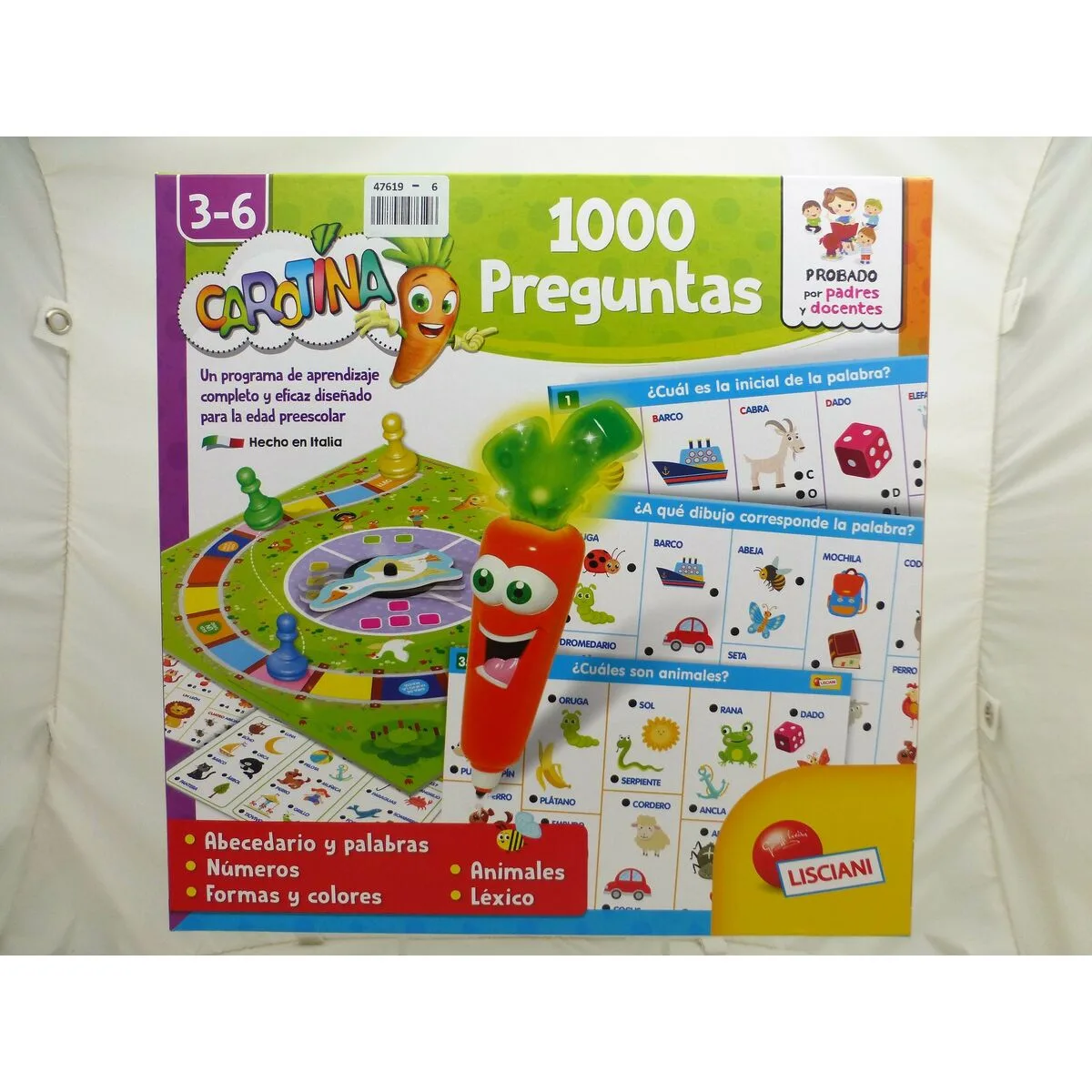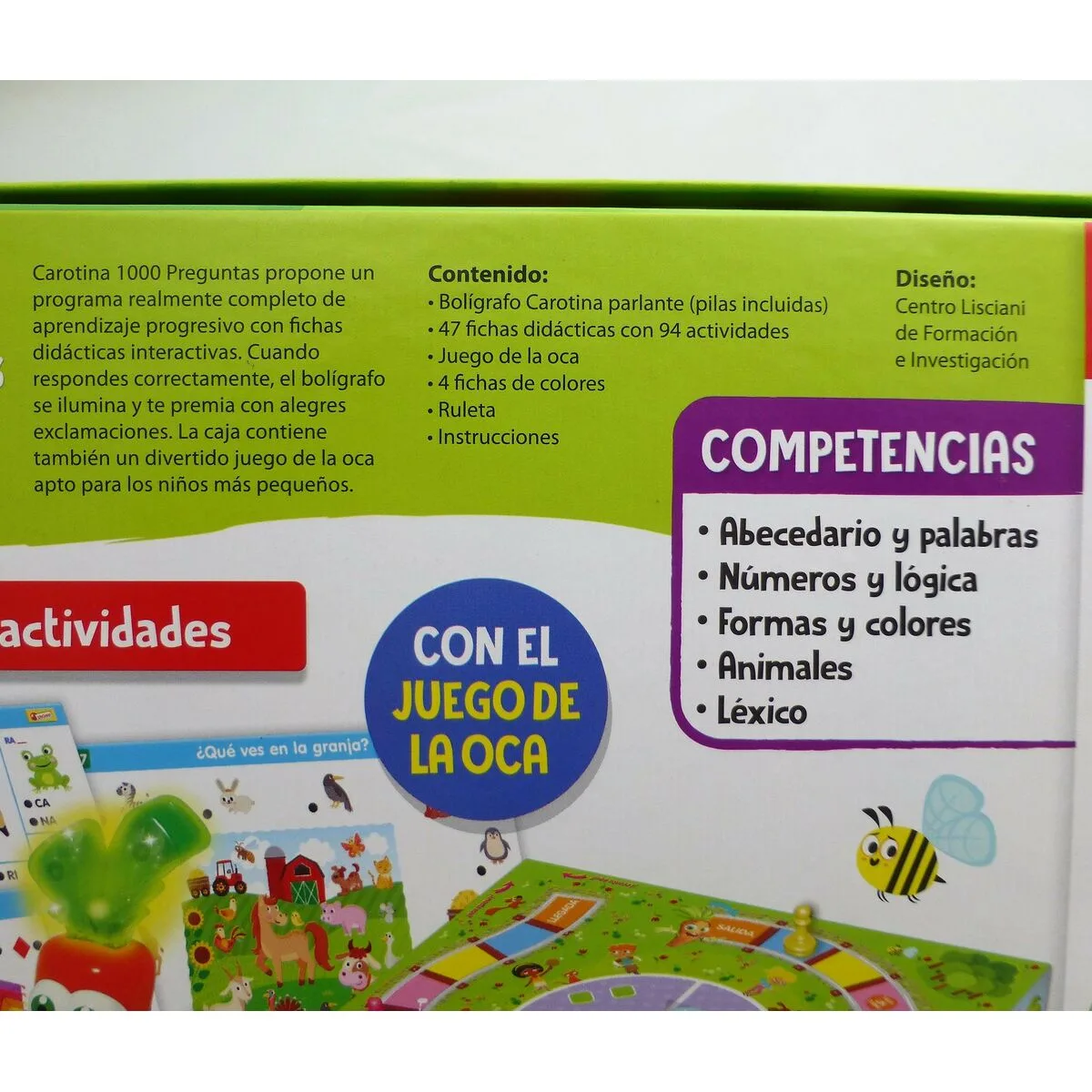 - Incluye: 47 fichas didácticas con 94 actividades y 1.000 preguntas, juego de la oca, 4 fichas de colores, ruleta, bolígrafo Carotina parlante e instrucciones