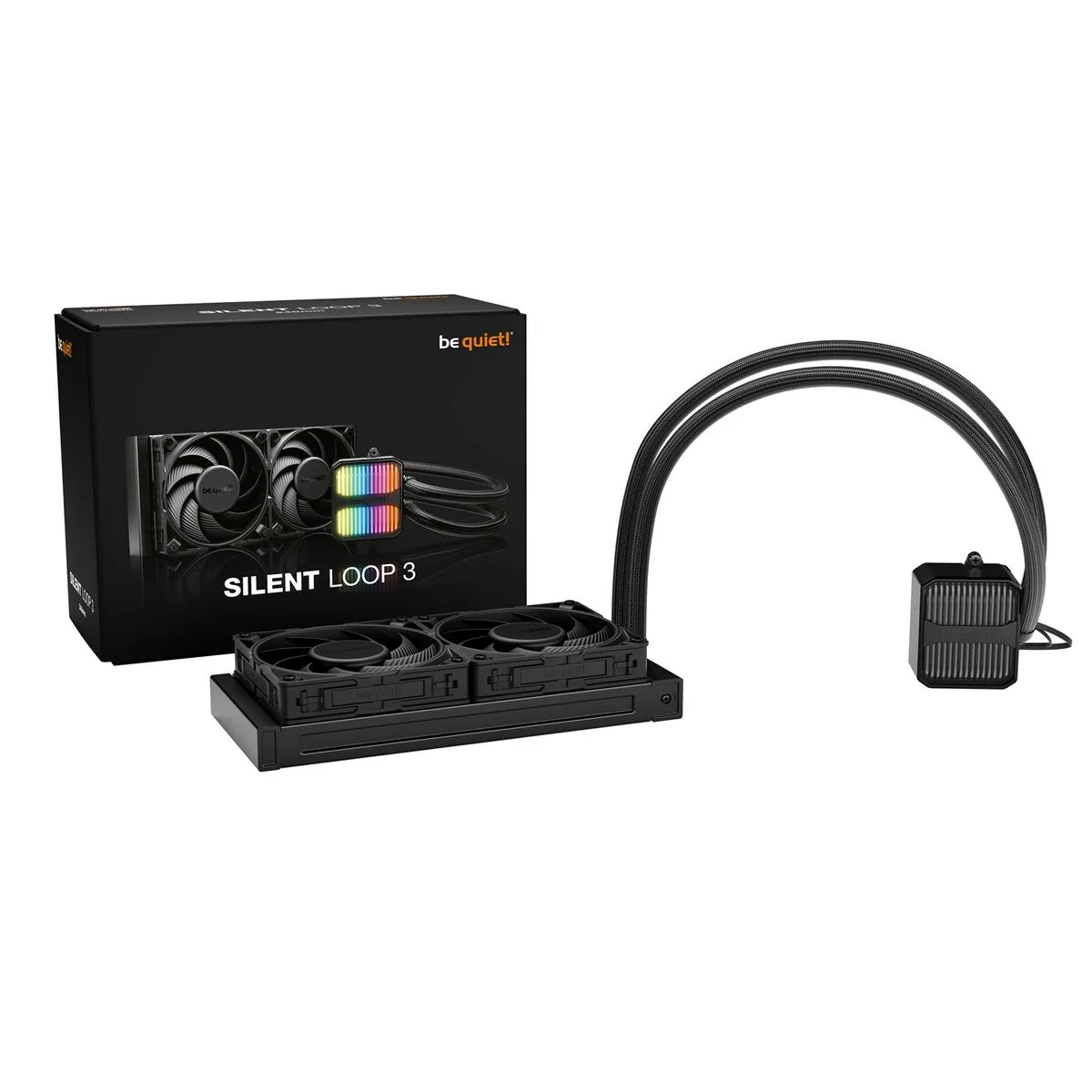 be quiet! Silent Loop 3 240 mm. Tipo: Sistema de refrigeración líquida todo en uno, Diámetro de ventilador: 12 cm, flujo de aire: 130,3 m³/h, Presión máxima de aire: 3,96 mmH2O, Tipo de soporte: Rodamiento dinámico fluido (FDB). Ancho: 120 mm, Profundidad: 52 mm, Altura: 277 mm. Color del producto: Negro
