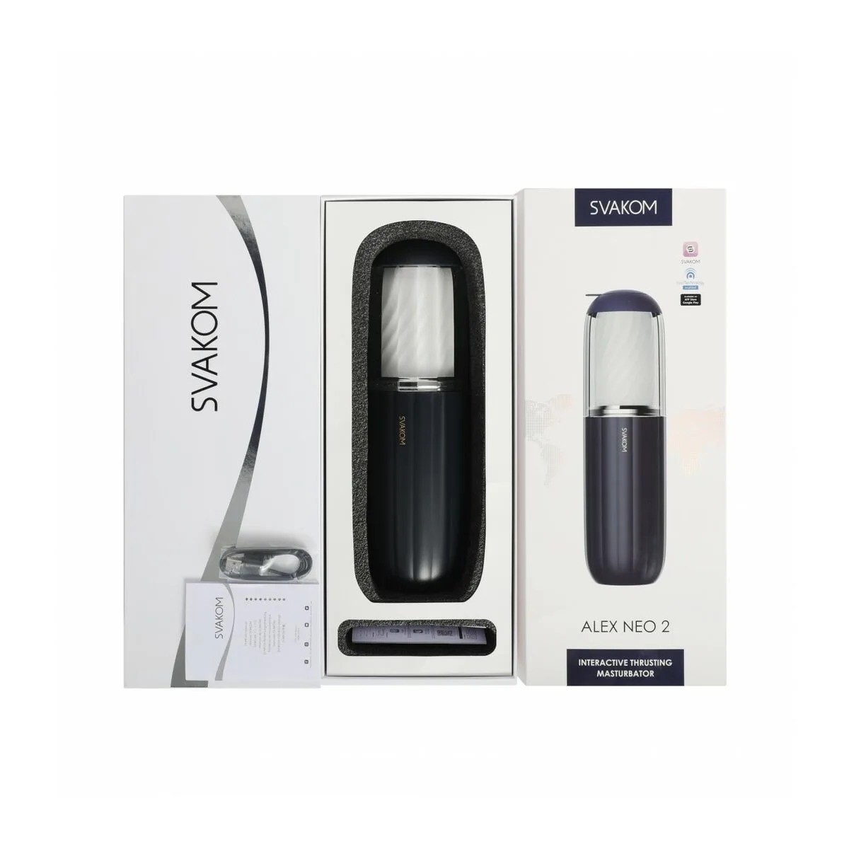 Svakom Alex Neo 2. Tipo de producto: Masturbador masculino, Apertura: Neutral, Color del producto: Negro, Transparente, Blanco. Ancho: 86 mm, Profundidad: 86 mm, Altura: 300 mm. Cantidad por paquete: 1 pieza(s)