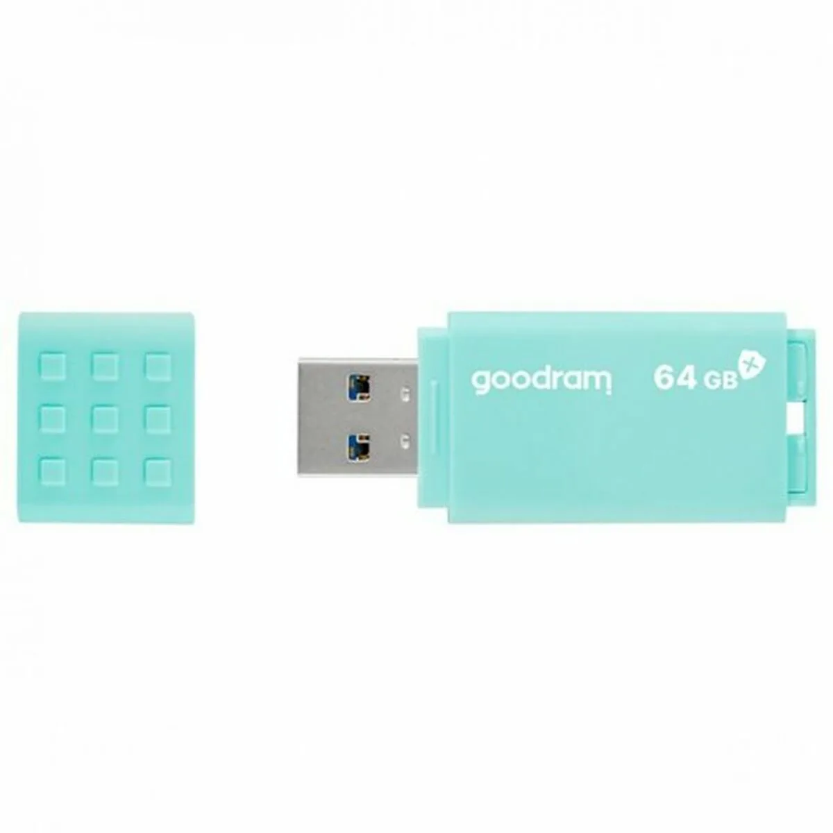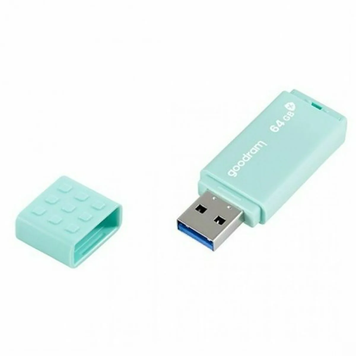 Goodram UME3. Capacidad: 64 GB, Interfaz del dispositivo: USB tipo A, Versión USB: 3.2 Gen 1 (3.1 Gen 1), Velocidad de lectura: 60 MB/s, Velocidad de escritura: 20 MB/s. Factor de forma: Tapa. Peso: 9 g. Color del producto: Turquesa