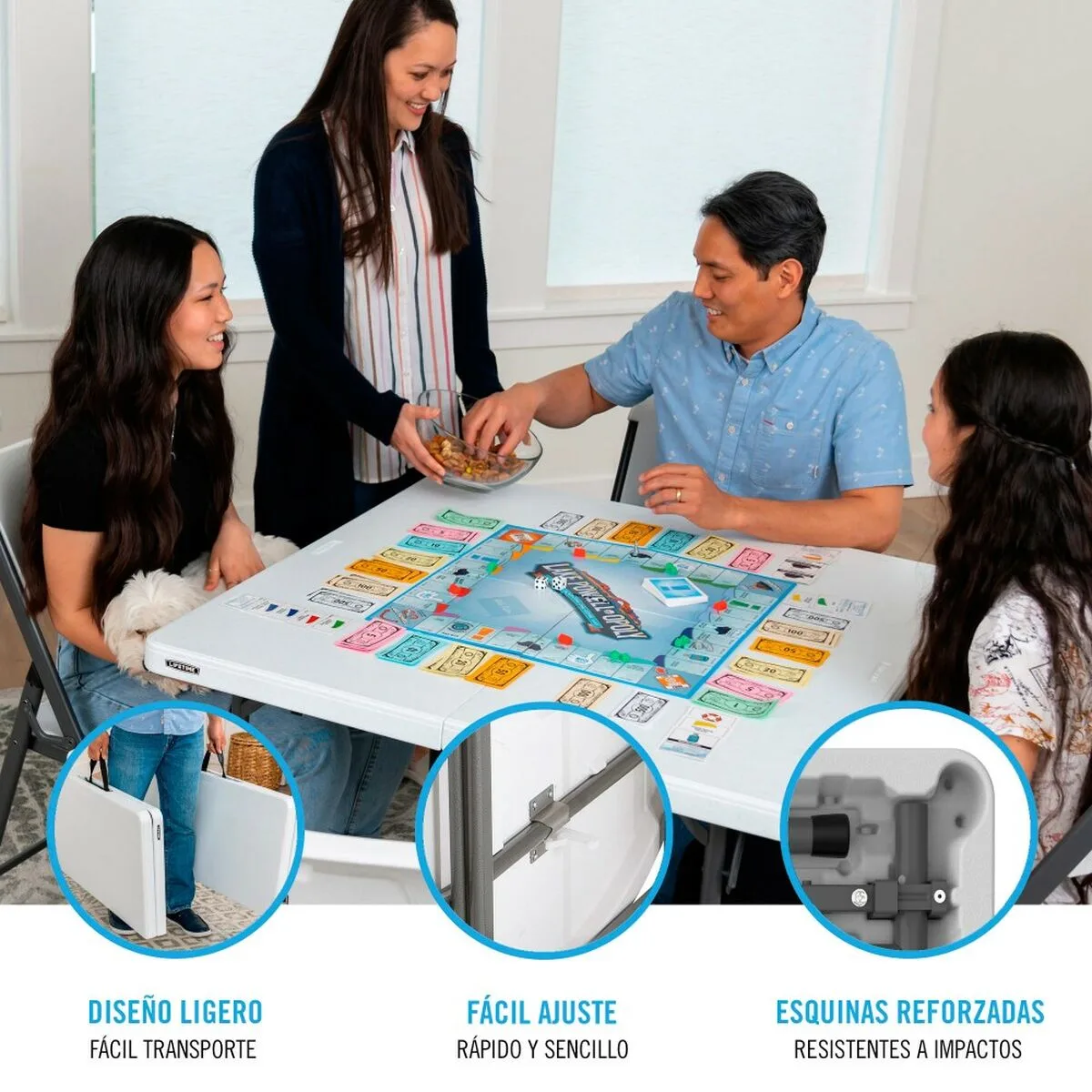 Mesa auxiliar plegable y portátil Lifetime. Tablero de polietileno de alta densidad con protección UV (grosor 38 mm) y estructura robusta de acero con revestimiento en polvo antióxido con tubos de 25 mm de diámetro. Medida abierta: 94 x 94 x 74 cm, medida cerrada: 94 x 49 x 9 cm. Soporta un peso máximo de 181 kg (distribución uniforme). Se pliega por la mitad y cuenta con asa de transporte, anclajes de seguridad y topes de goma protectores. Duradera, resistente y ligera (9 kg), ideal para 4 personas.