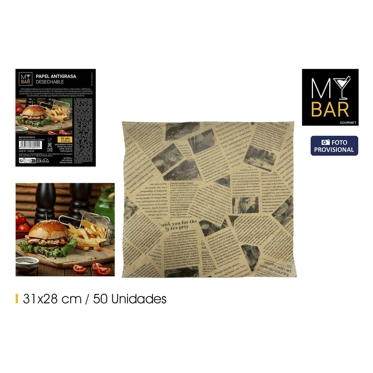 El papel de cocina My Bar es un producto diseñado para ofrecer funcionalidad y practicidad en entornos domésticos y profesionales que requieren materiales para manipulación y servicio de alimentos. Este papel antibgrasas destaca por su color blanco, que aporta una imagen limpia y neutra, idónea para cualquier presentación gastronómica. Las dimensiones de cada hoja son de 20 x 20 cm, tamaño ideal para envolver porciones pequeñas, absorber grasas o funcionar como base para alimentos, garantizando mayor higiene y facilidad en el manejo. Cada paquete contiene 50 piezas, lo que proporciona una cantidad suficiente para uso continuo sin necesidad de recambios frecuentes, facilitando la organización y el control en cocinas o puntos de venta. Su calidad permite un uso versátil, desde la protección sobre superficies hasta el contacto directo con alimentos grasos o húmedos sin que traspase, gracias a su tratamiento antigrasas que evita manchas y derrames. Este papel de cocina es una solución eficiente y funcional que cumple con las expectativas básicas de resistencia y practicidad, adecuándose a las necesidades de orden y limpieza en cualquier espacio dedicado a la preparación o consumo de alimentos. En resumen, el papel de cocina My Bar ofrece una combinación equilibrada de tamaño, cantidad y tratamiento especial para quienes buscan una opción fiable y sencilla para el manejo higiénico de alimentos en bares, restaurantes o en el hogar.