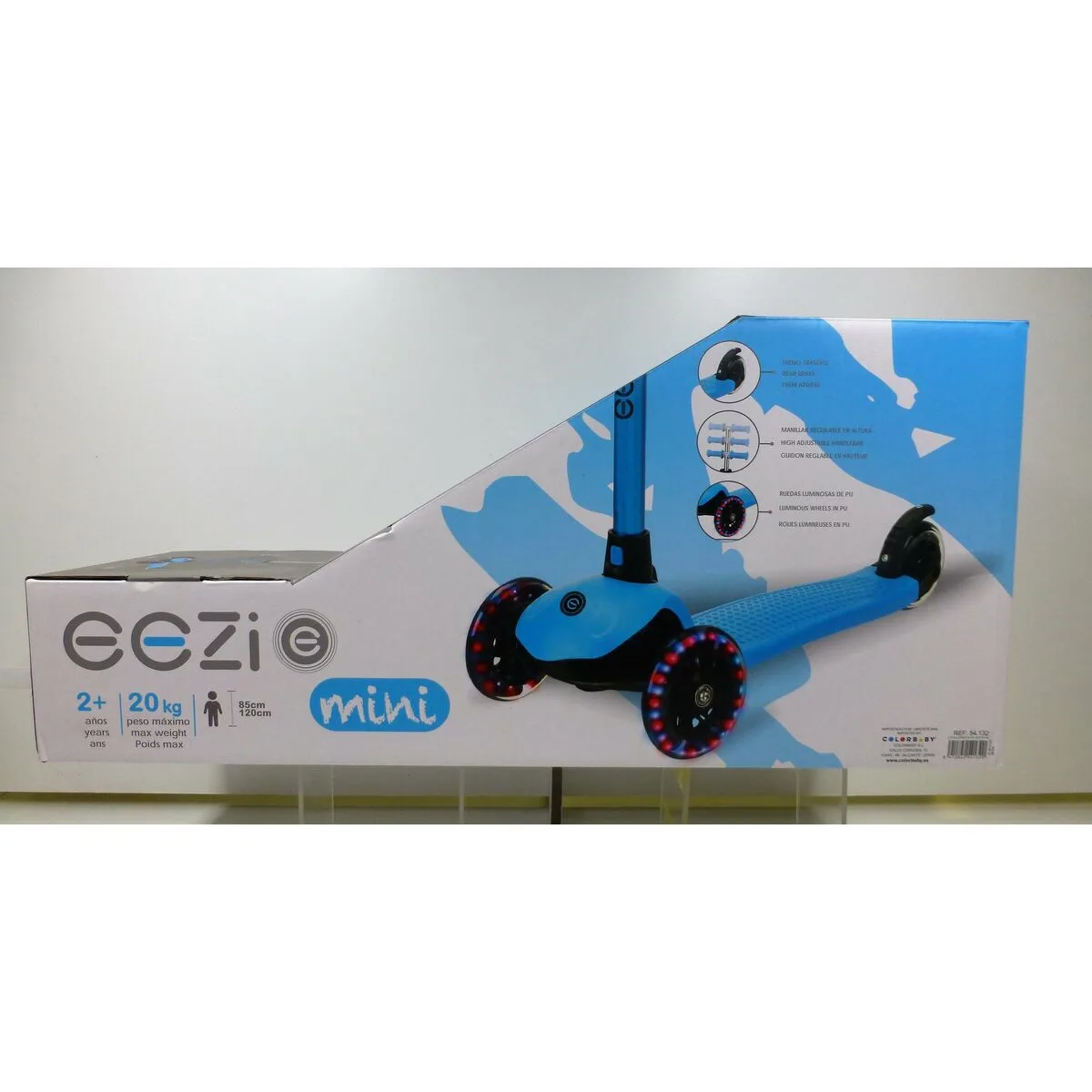 - Diseño: patinete de 3 ruedas color azul con detalles en negro (26x61x55,5-62,5 cm)