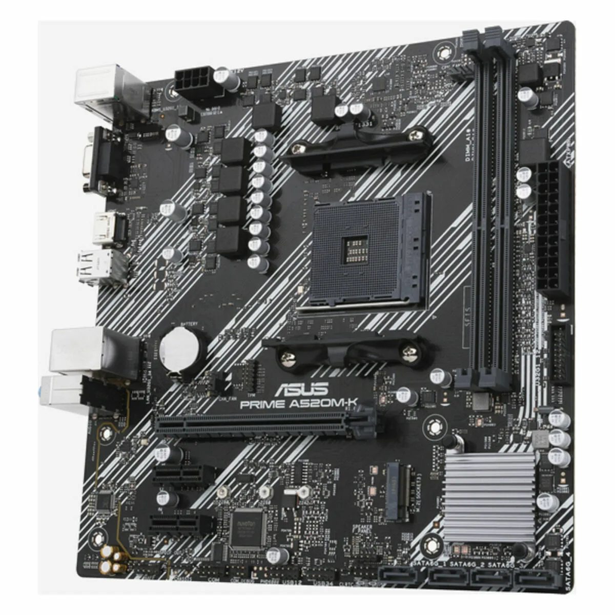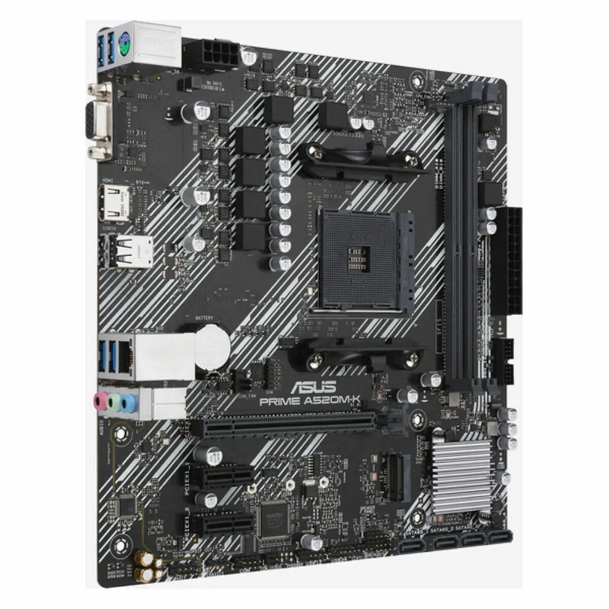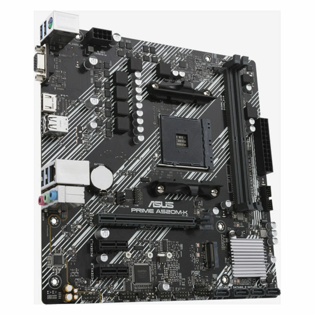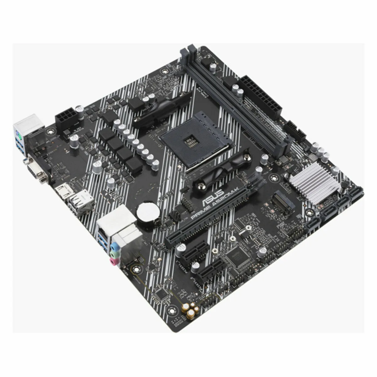ASUS PRIME A520M-K. Fabricante de procesador: AMD, Socket de procesador: Zócalo AM4, Procesador compatible: AMD Ryzen™ 3, AMD Ryzen™ 5, AMD Ryzen™ 7. tipos de memoria compatibles: DDR4-SDRAM, Memoria interna máxima: 64 GB, Tipo de ranuras de memoria: DIMM. Interfaces de disco de almacenamiento soportados: M.2, SATA III, Tipos de unidades de almacenamiento admitidas: HDD & SSD, Niveles RAID: 0, 1, 10. Conector USB: USB tipo A. Tipo de interfaz ethernet: Gigabit Ethernet, Controlador LAN: Realtek RTL8111H
