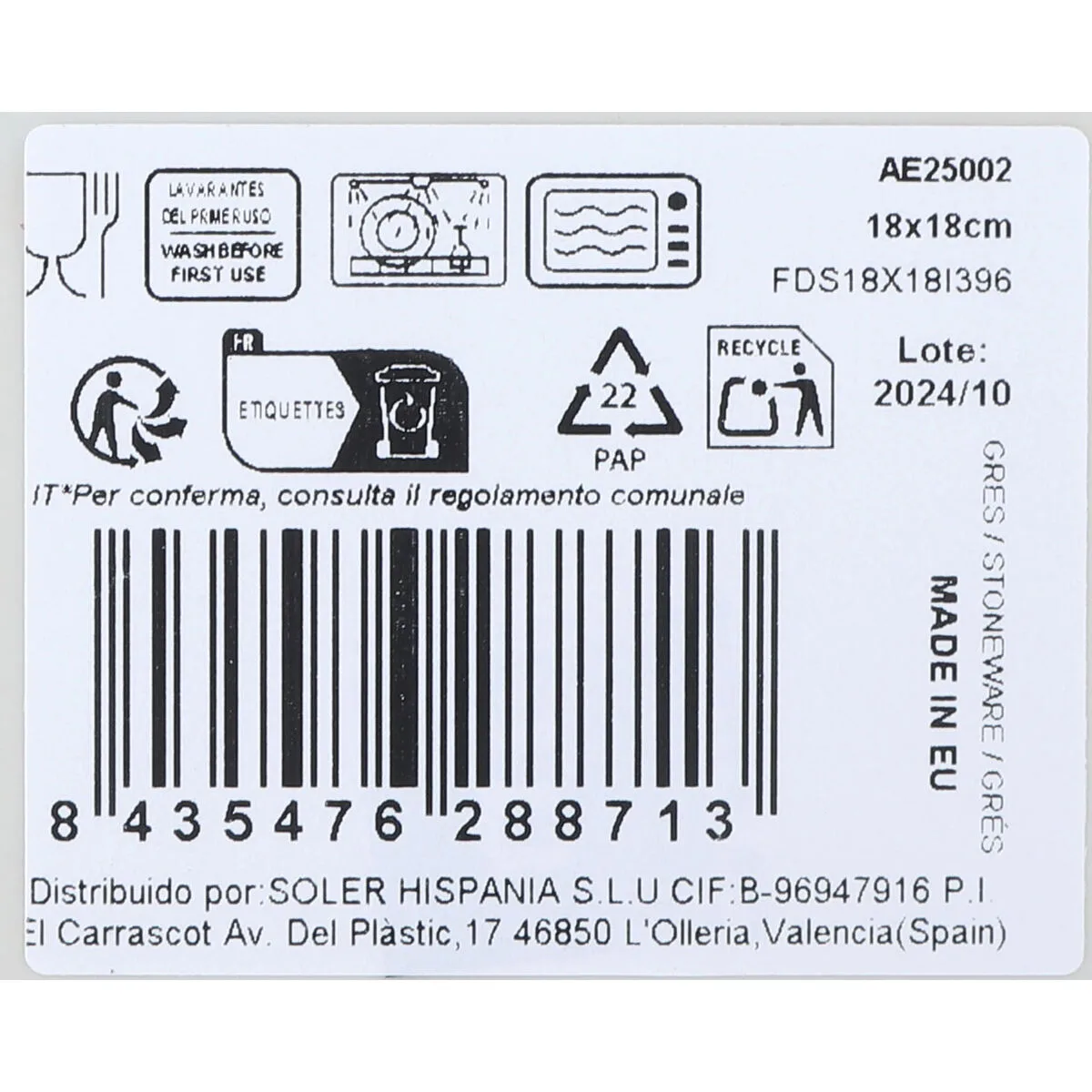 - Medidas aprox.: 18 x 18 x 2 cm
