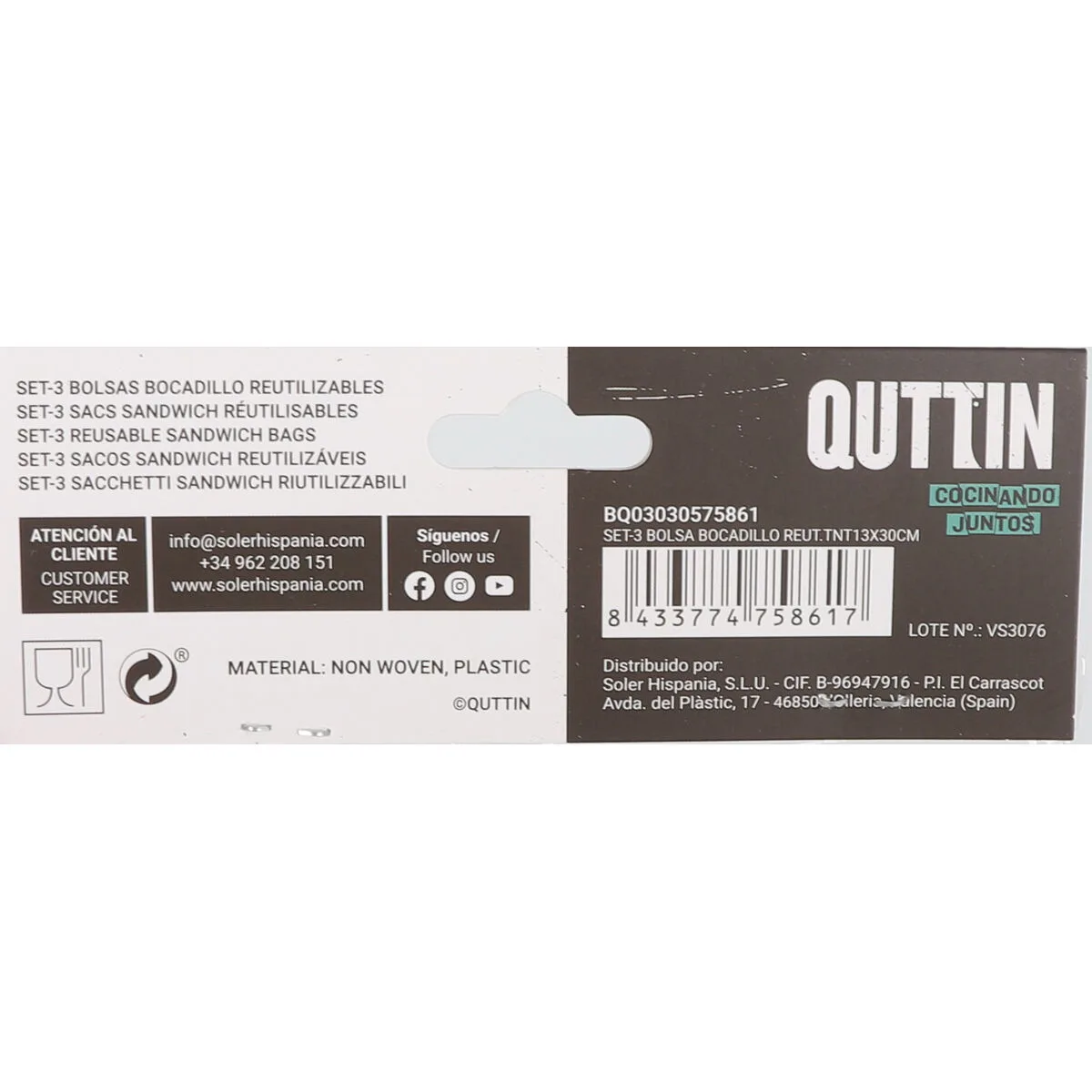 SET DE BOLSAS REUTILIZABLES PARA ALIMENTOS QUTTIN PORTABOCADILLOS TNT (NON WOVEN) 3 PIEZAS 13 X 30 CM (36 UNIDADES)… Enviado a toda España y a Madrid, Barcelona, Valencia, Sevilla, Zaragoza, Málaga, Murcia, Palma de Mallorca, Las Palmas y Bilbao …