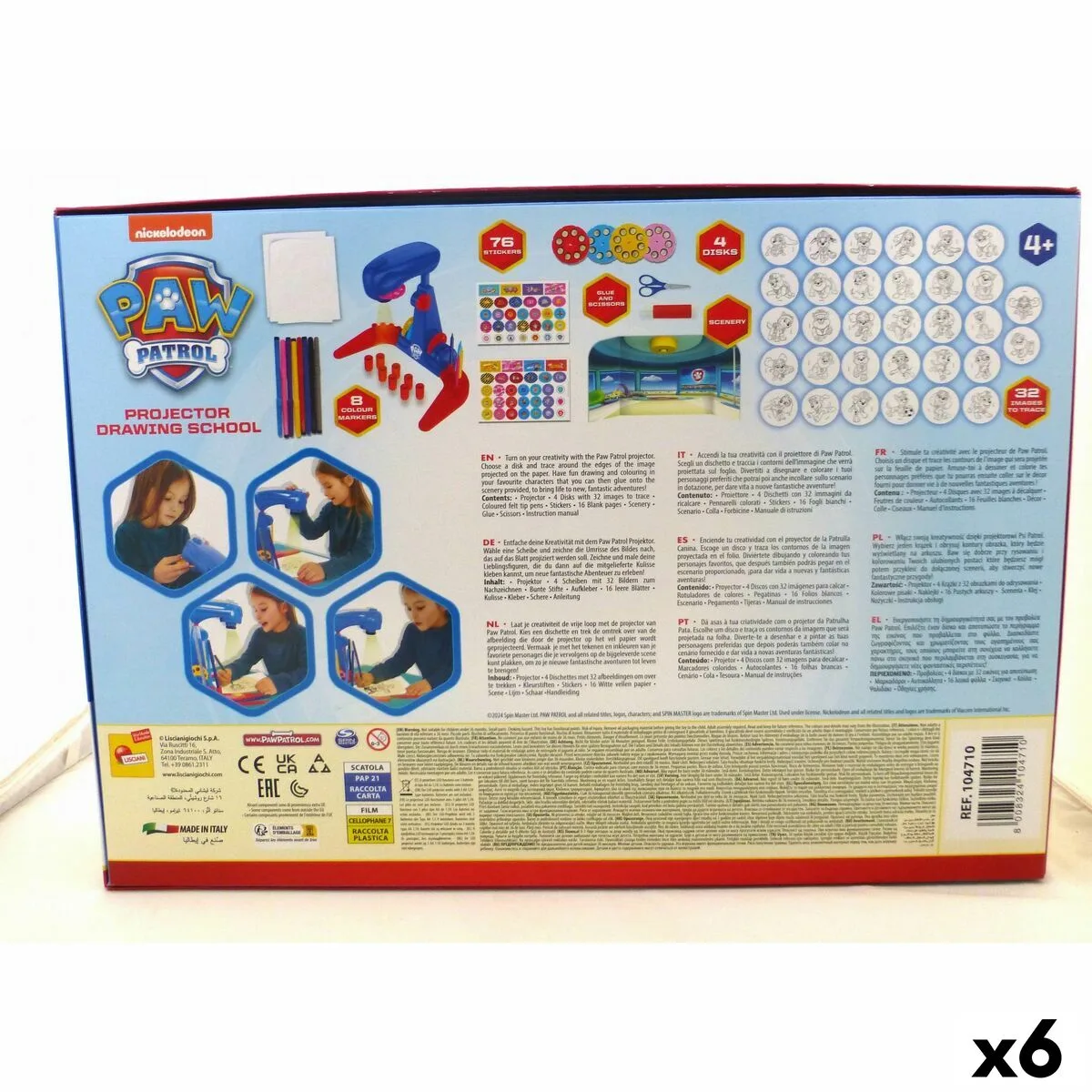 ¡Dibuja y colorea a tus personajes favoritos de La Patrulla Canina con este superproyector! ¡Perfecto para pequeños artistas que aman a los cachorros más valientes de todos los tiempos! Incluye: 1 proyector, 4 discos con un total de 32 imágenes para calcar, 8 rotuladores de colores, 76 pegatinas, folios, 1 escenario de cartón, pegamento, tijeras y manual de instrucciones. Escoge uno de los discos, proyecta la imagen y traza los contornos en los folios blancos. Después, usa los rotuladores para colorear y decora tus creaciones o el escenario de cartón con las pegatinas para dar vida a nuevas y emocionantes aventuras. Un regalo maravilloso para todos los fans de La Patrulla Canina, ideal para desarrollar la motricidad fina, la creatividad y la imaginación.