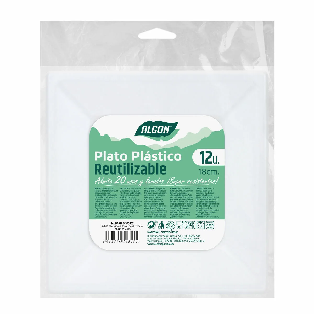 8 valoraciones en SET DE PLATOS REUTILIZABLES ALGON CUADRADO BLANCO PLÁSTICO 18 X 18 X 4 CM (24 UNIDADES)