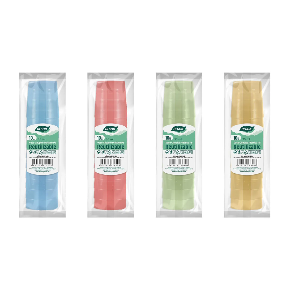 SET DE VASOS DE CHUPITO ALGON REUTILIZABLE 10 PIEZAS 35 ML (50 UNIDADES)... Enviado a toda España y a Madrid, Barcelona, Valencia, Sevilla, Zaragoza, Málaga, Murcia, Palma de Mallorca, Las Palmas y Bilbao ...