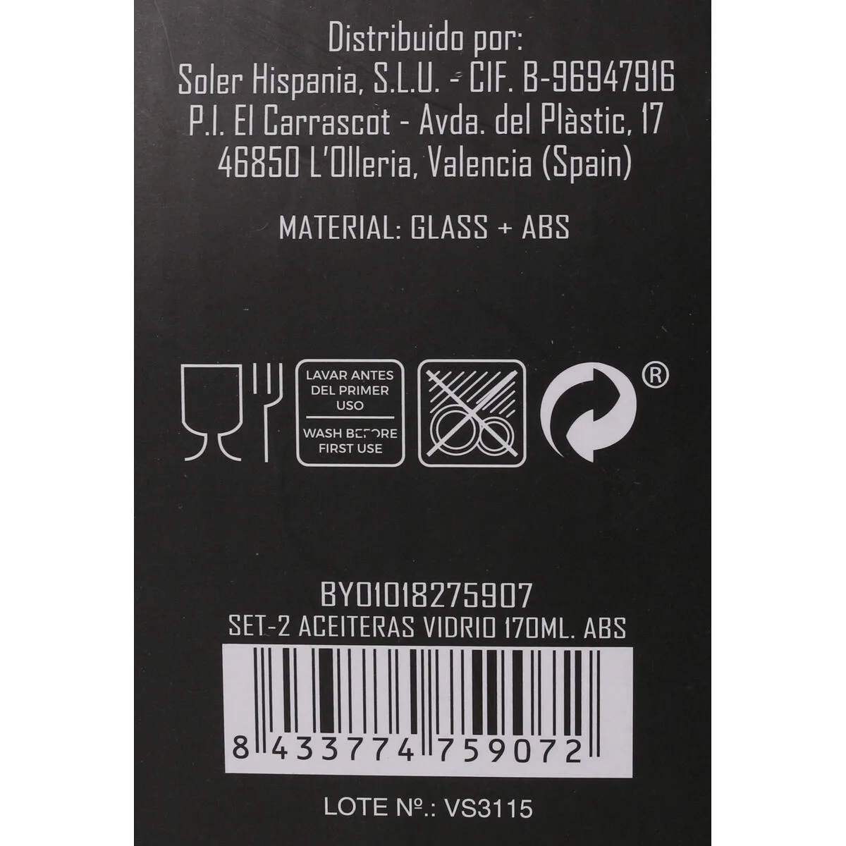 Sé el primero en valorar “SET PARA ALIÑAR ANNA TRANSPARENTE PLATEADO VIDRIO ABS 170 ML 5 X 5 X 20 CM 2 PIEZAS (24 UNIDADES)” Cancelar la respuesta