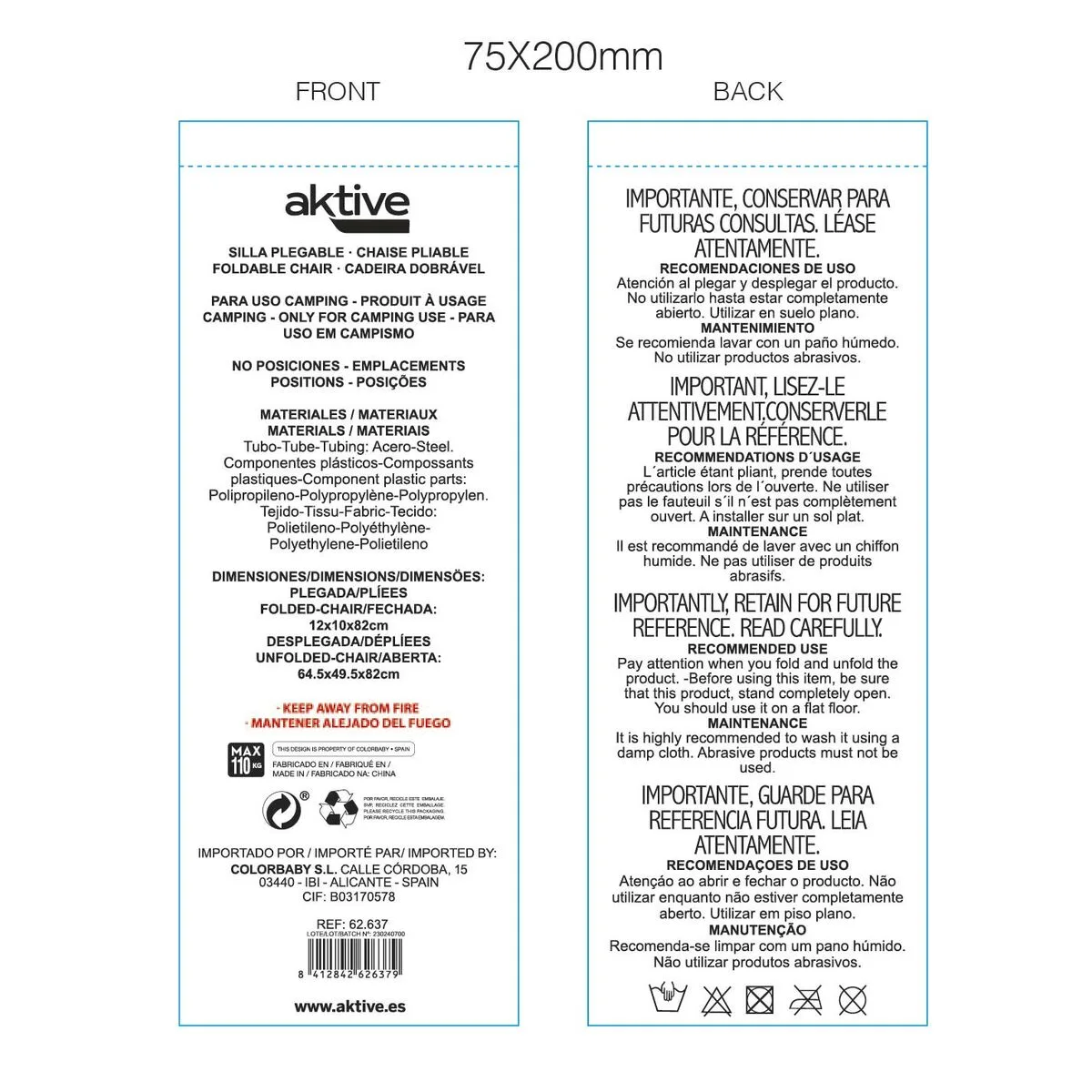 - Medidas: silla desplegada 64,5×49,5×82 cm, plegada 12×82 cm, altura asiento 41 cm