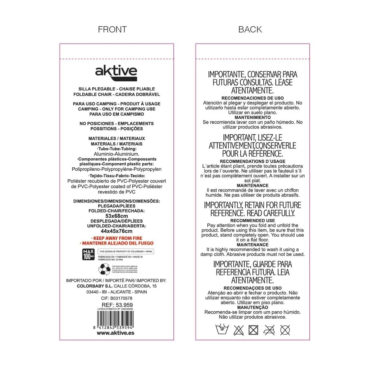 SILLA PLEGABLE AKTIVE FLAMINGO CORAL 48 X 99 X 57 CM (4 UNIDADES)... Enviado a toda España y a Madrid, Barcelona, Valencia, Sevilla, Zaragoza, Málaga, Murcia, Palma de Mallorca, Las Palmas y Bilbao ...
