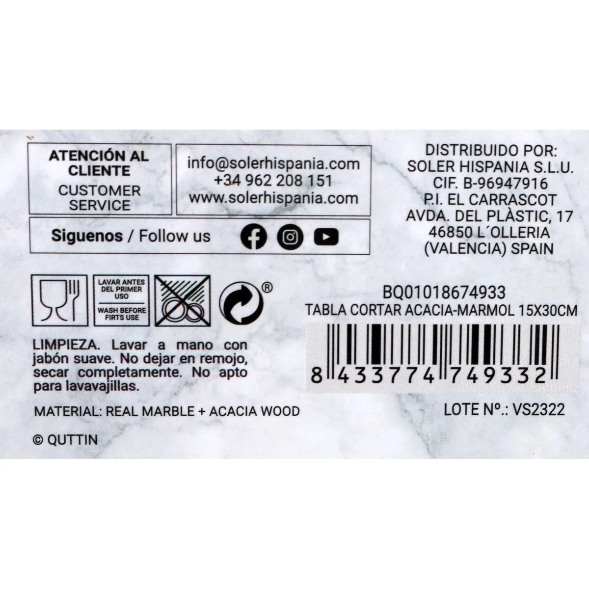 TABLA DE CORTAR QUTTIN MÁRMOL ACACIA 15 X 30 CM (10 UNIDADES)… Enviado a toda España y a Madrid, Barcelona, Valencia, Sevilla, Zaragoza, Málaga, Murcia, Palma de Mallorca, Las Palmas y Bilbao …